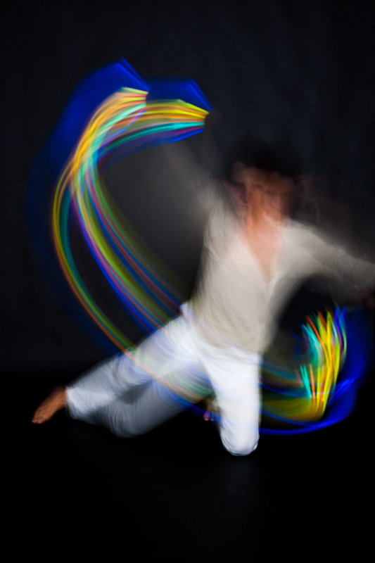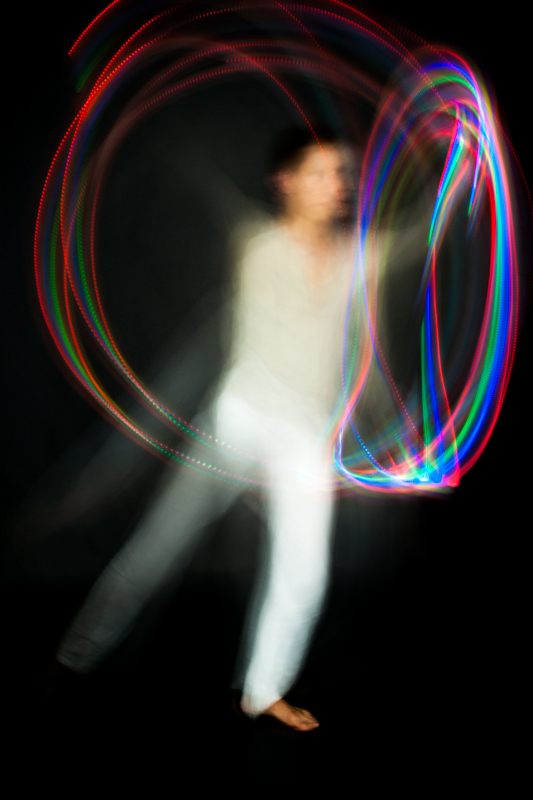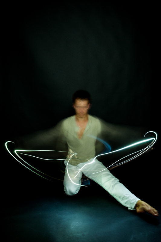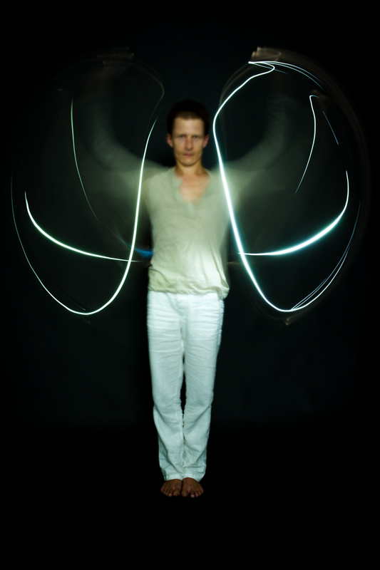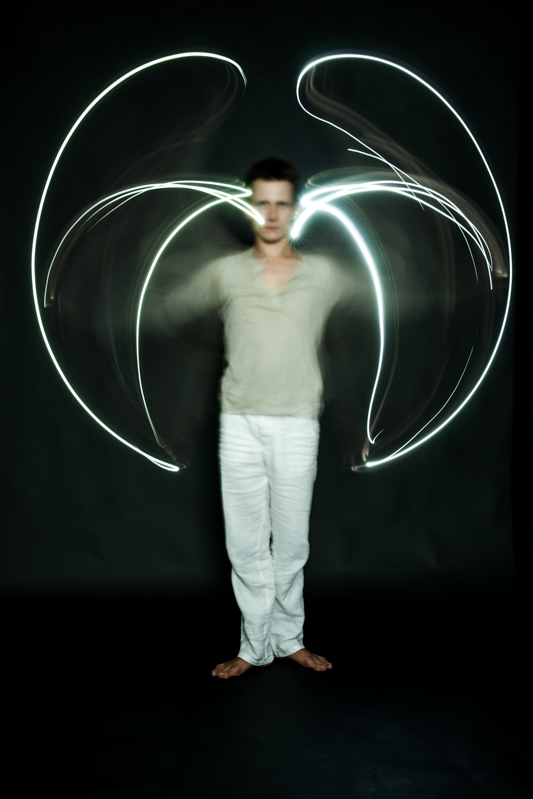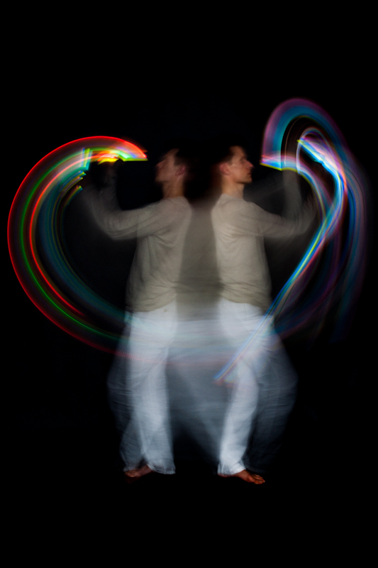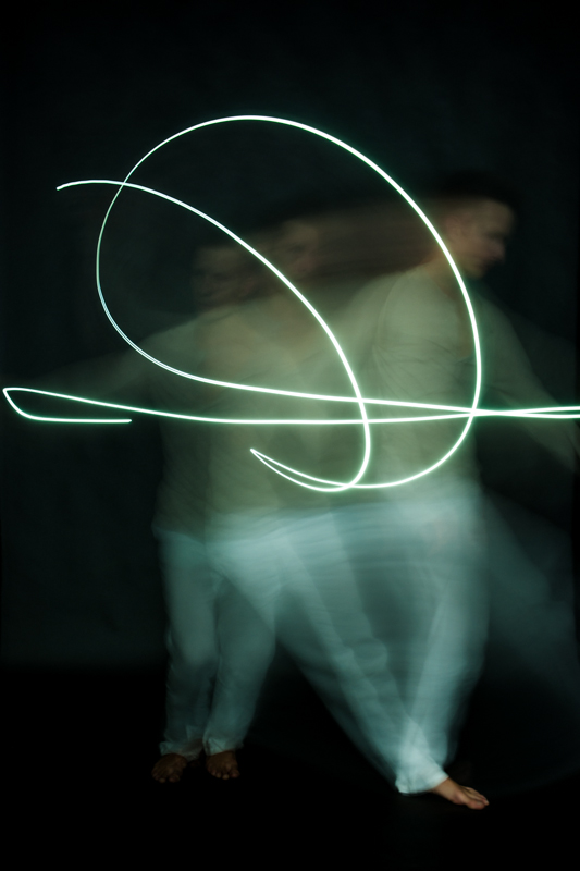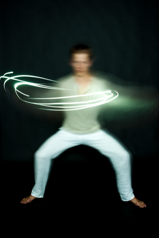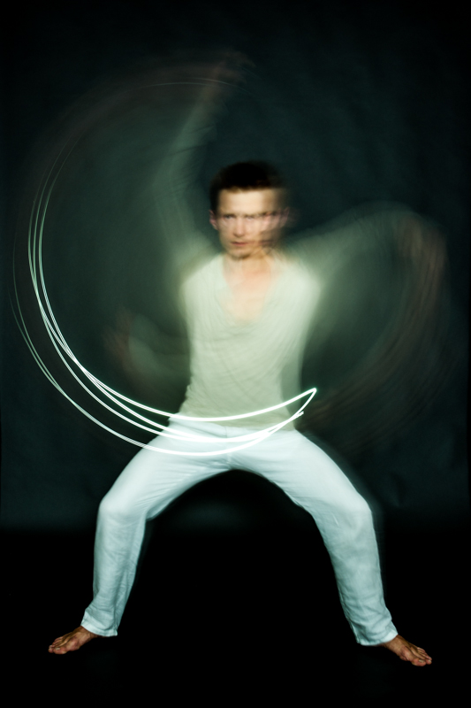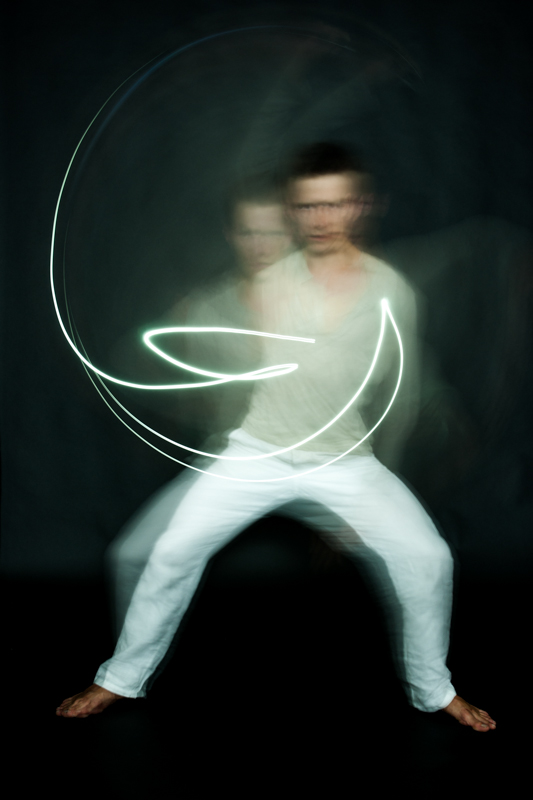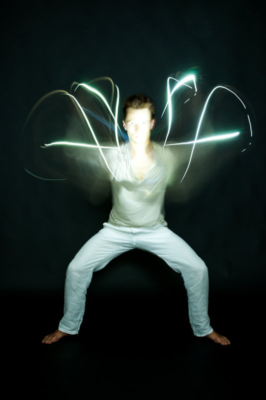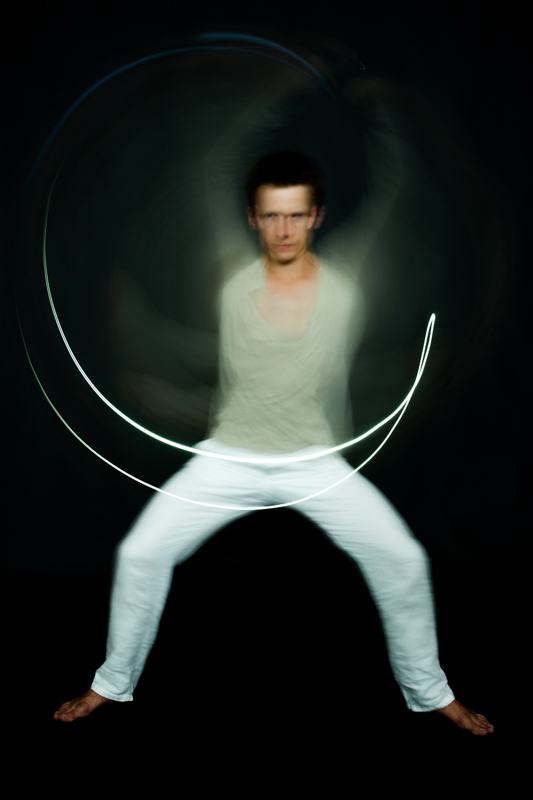 This was far from a standard studio shoot (the catch phrases for this shoot should be Abstract, Symmetrical, Flowing, Contrast etc), we wanted to capture the essence of movement. The first step was only to have a very low level of constant light in the studio (any one who has been in the studio with me will know how much I love flash) . This would allow long exposure times at an aperture some where around f8 to f11. The light needed to be enough to highlight the movement of Piotr but drown out the various light sources he was using for the light painting. As light-sources for the light painting we used a variety of resources, glow sticks, led lamps and cell phones. As music I chose mix of Café del Mar to help set the right atmosphere.