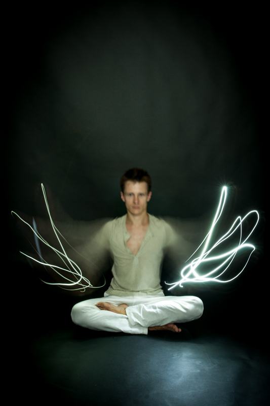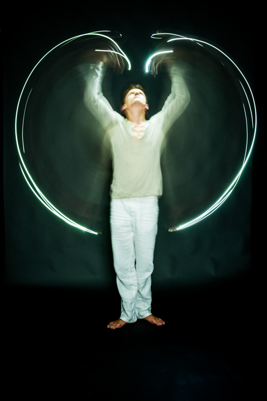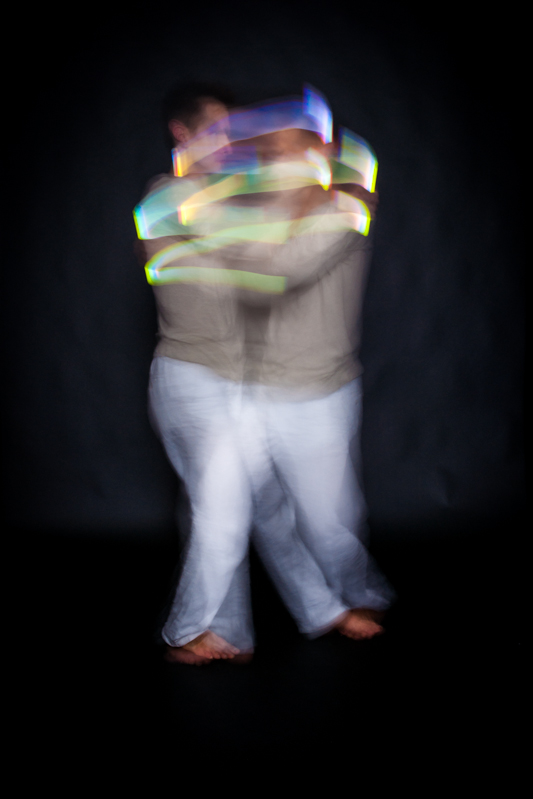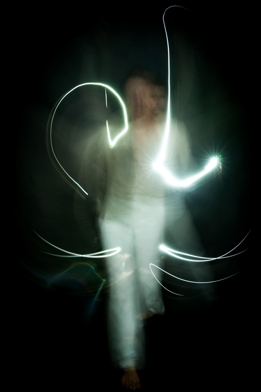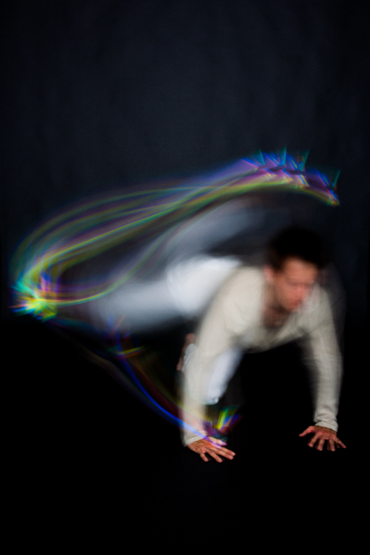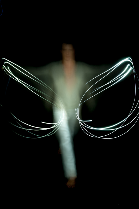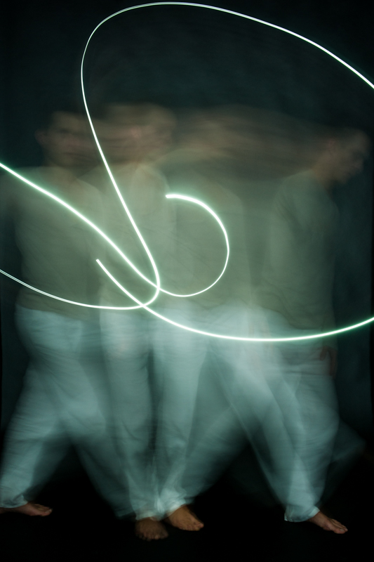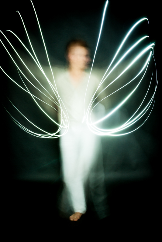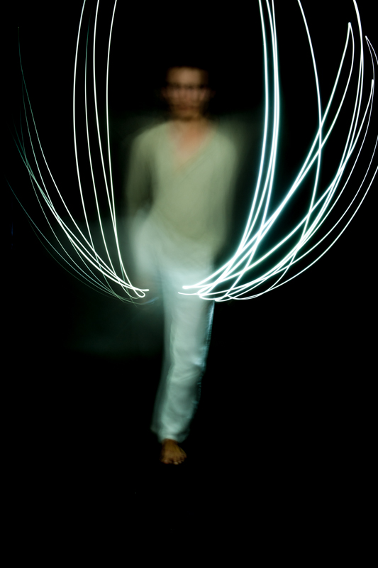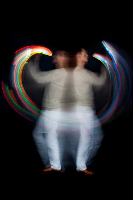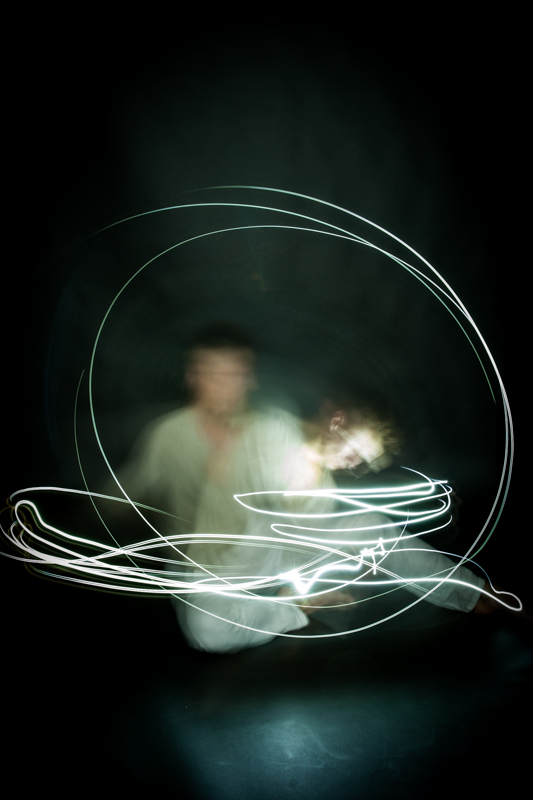 This was far from a standard studio shoot (the catch phrases for this shoot should be Abstract, Symmetrical, Flowing, Contrast etc), we wanted to capture the essence of movement. The first step was only to have a very low level of constant light in the studio (any one who has been in the studio with me will know how much I love flash) . This would allow long exposure times at an aperture some where around f8 to f11. The light needed to be enough to highlight the movement of Piotr but drown out the various light sources he was using for the light painting. As light-sources for the light painting we used a variety of resources, glow sticks, led lamps and cell phones. As music I chose mix of Café del Mar to help set the right atmosphere.