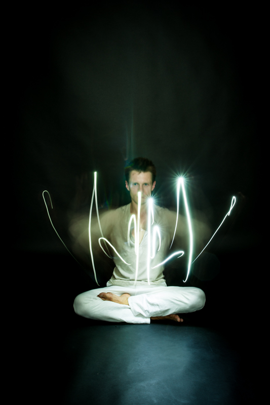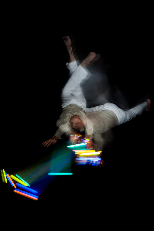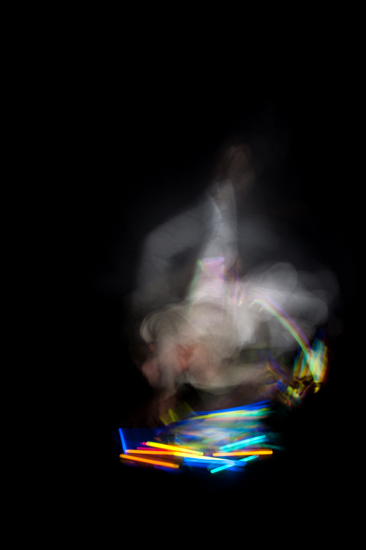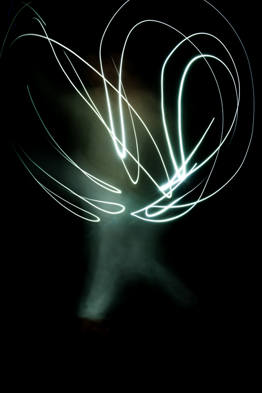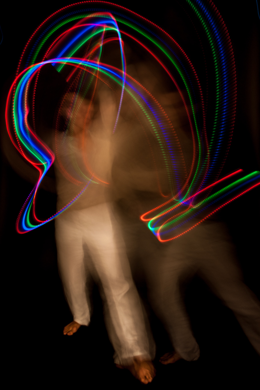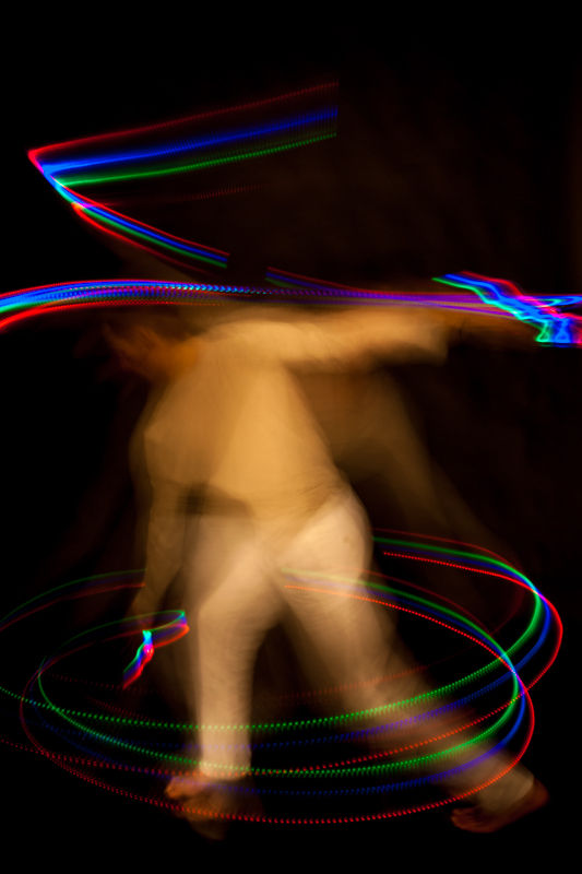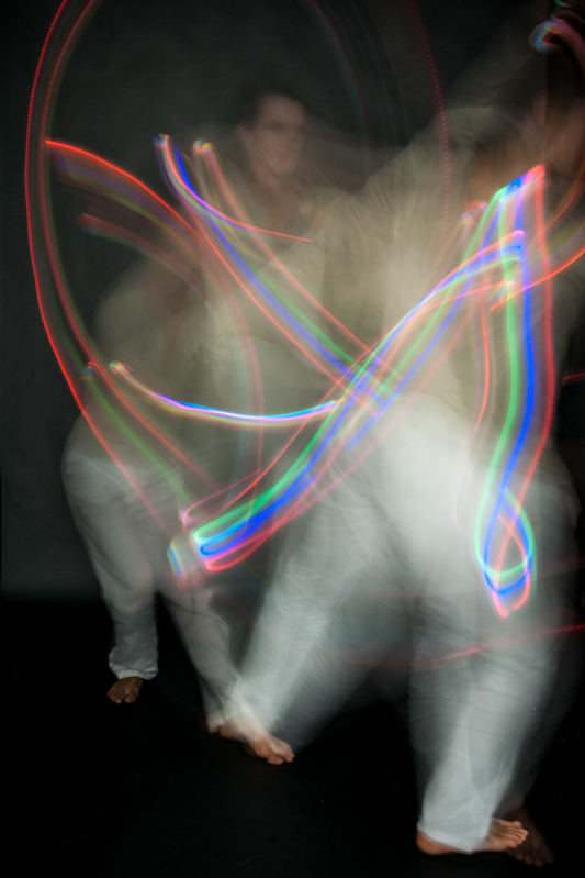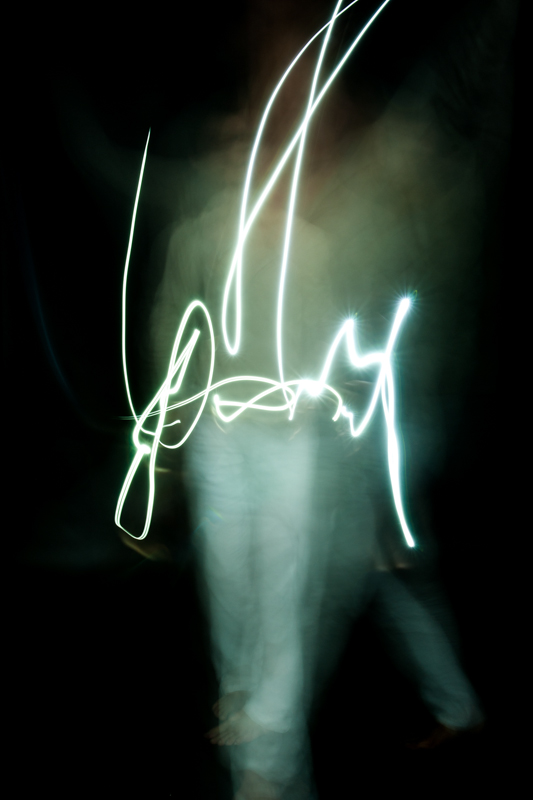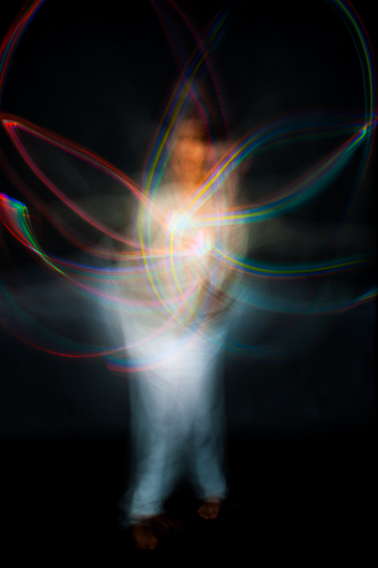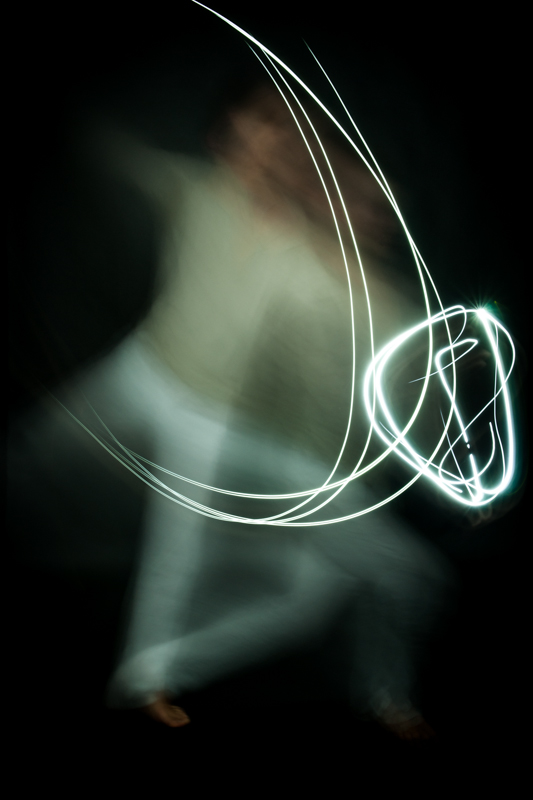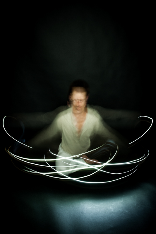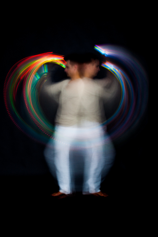 This was far from a standard studio shoot (the catch phrases for this shoot should be Abstract, Symmetrical, Flowing, Contrast etc), we wanted to capture the essence of movement. The first step was only to have a very low level of constant light in the studio (any one who has been in the studio with me will know how much I love flash) . This would allow long exposure times at an aperture some where around f8 to f11. The light needed to be enough to highlight the movement of Piotr but drown out the various light sources he was using for the light painting. As light-sources for the light painting we used a variety of resources, glow sticks, led lamps and cell phones. As music I chose mix of Café del Mar to help set the right atmosphere.